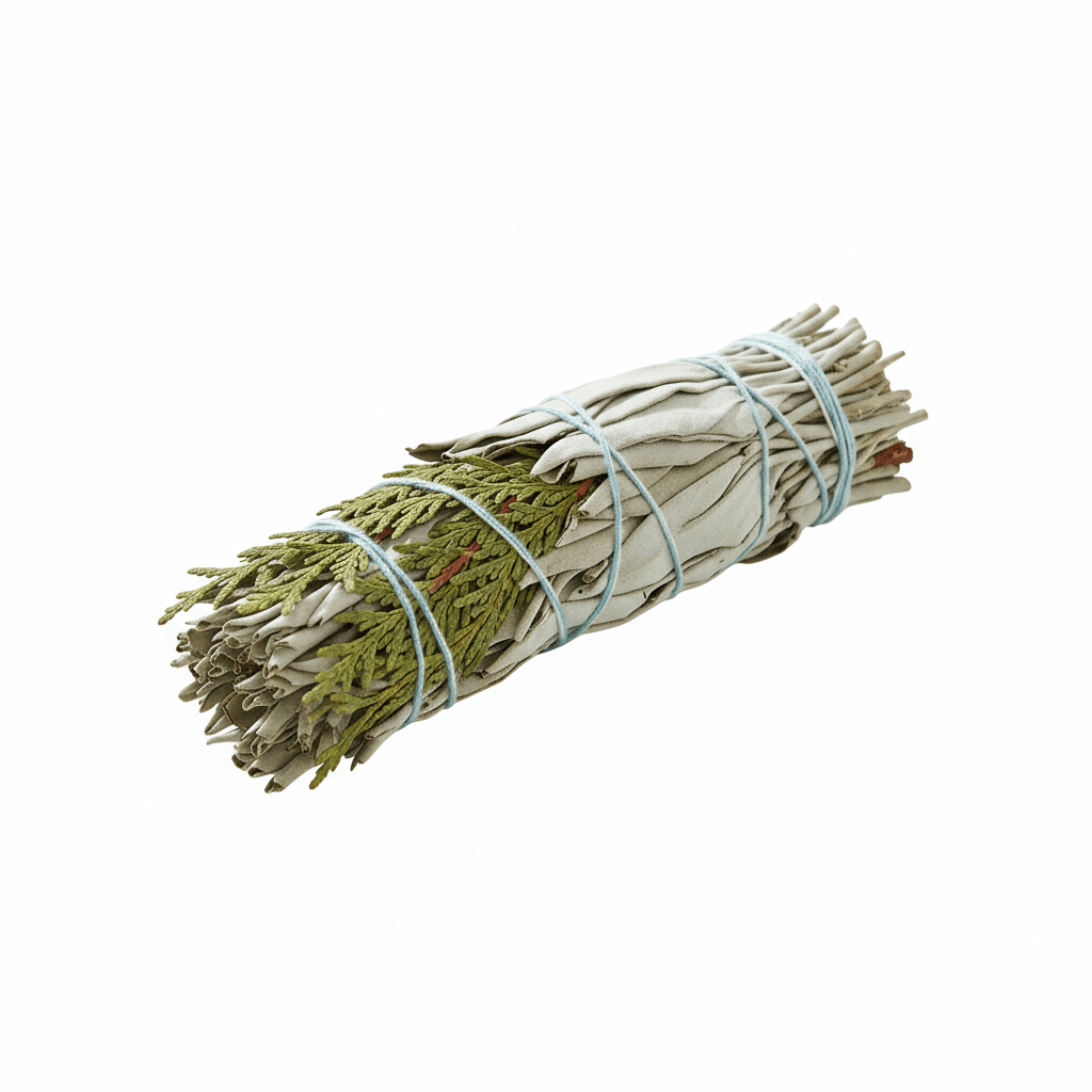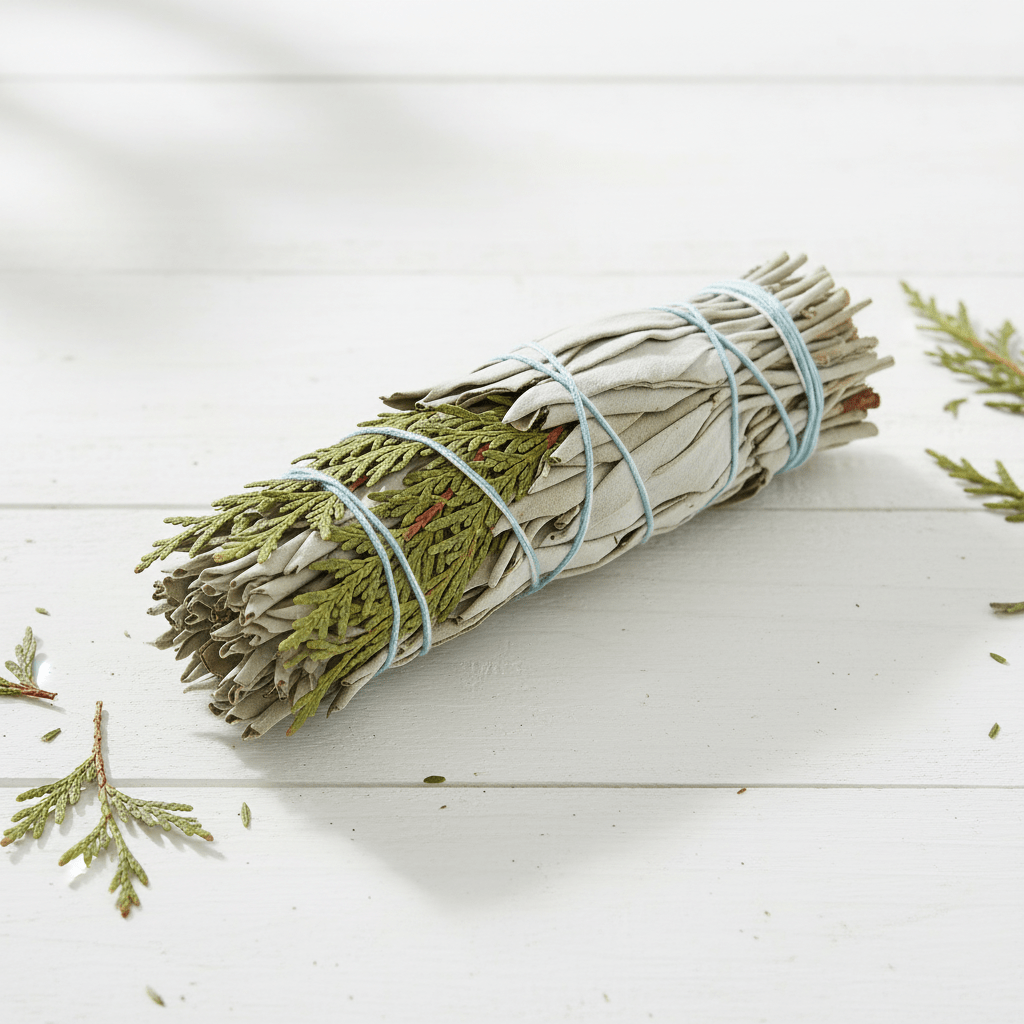 Weißer Salbei klärt, löst und befreit, während Zeder Halt, Schutz und innere Standfestigkeit schenkt.