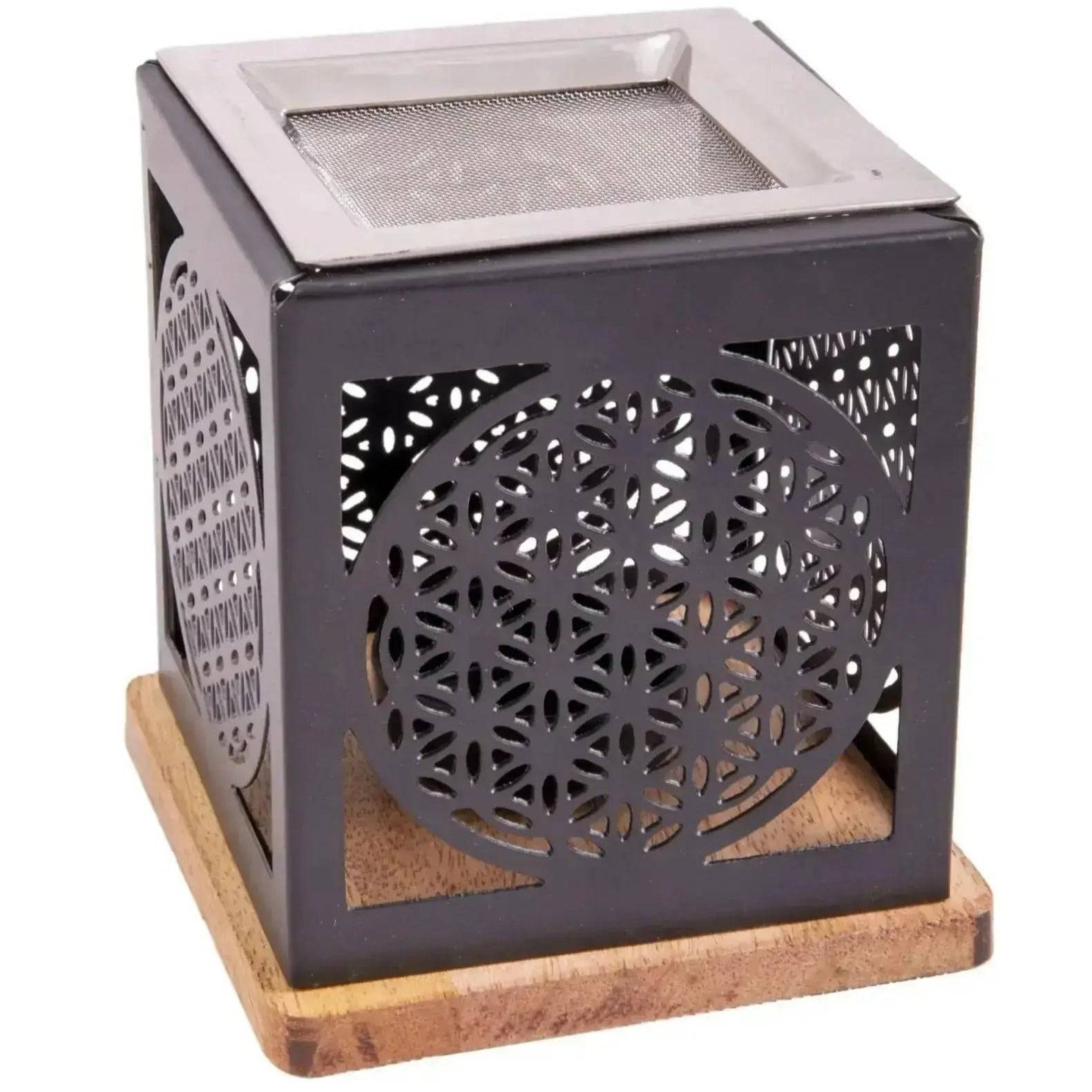 Für das energetisierende Räuchern. Zauberhaftes Räucherstövchen mit quadratischem Sieb mit Mangoholzsockel und ausgestanzter Lebensblume.