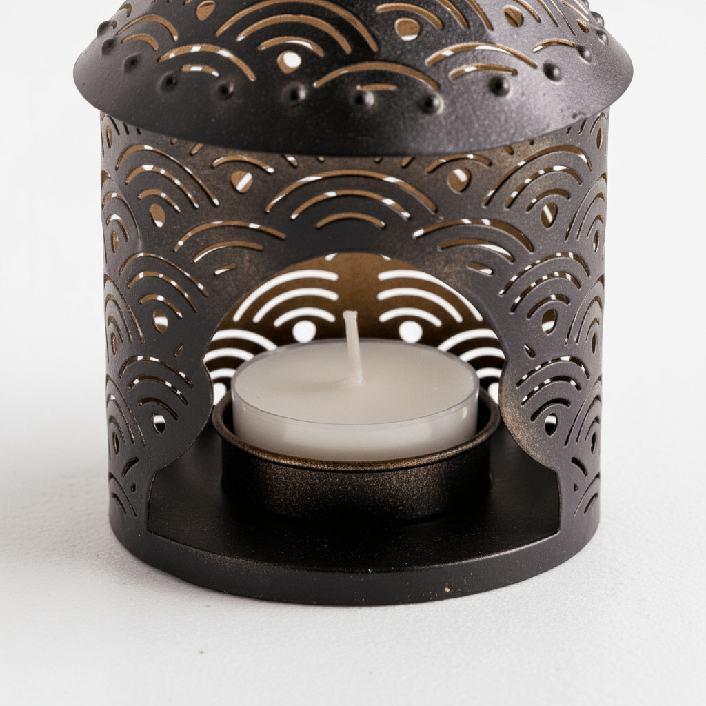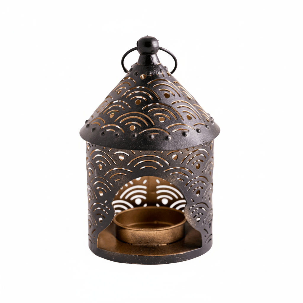 Die feinen Durchbrüche im Metall lassen das Kerzenlicht sanft nach außen strahlen und schaffen eine stimmungsvolle Atmosphäre – ob im Wohnraum, auf dem Balkon oder im geschützten Außenbereich.