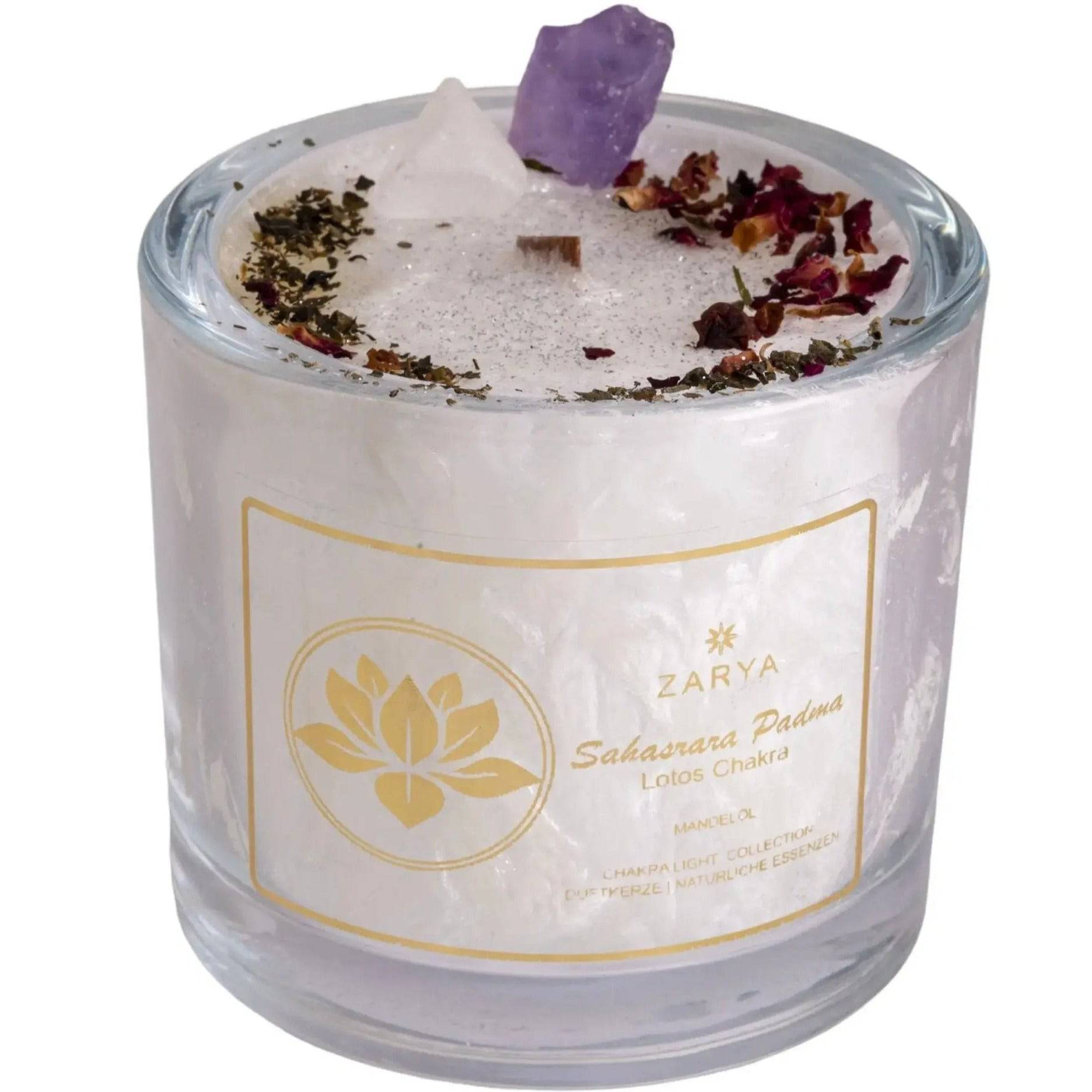 hochwertige Chakra Duftkerze, ist aus 100% pflanzlichen Stearin (kbA) mit naturreinen ätherischen Ölen, echten Edelsteinen und Bio-Pflanzenmischungen, in liebevoller Handarbeit in Deutschland gefertigt.