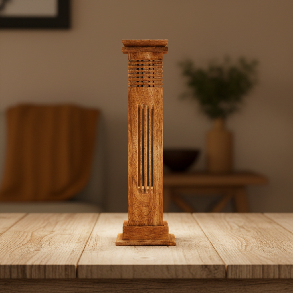 Der Deva Räucherturm ist ein kunstvoll gearbeiteter, 38,5 cm hoher Räucherstäbchenhalter aus hochwertigem Mangoholz.