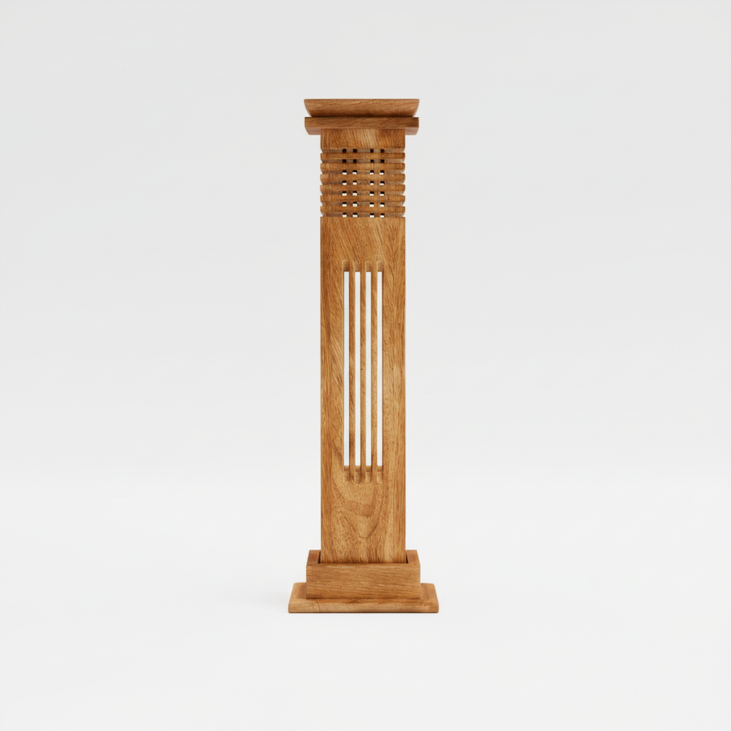 Im Inneren befindet sich ein geschützter Bereich für das Räucherstäbchen – der Turm öffnet den Raum für duftende Rituale und bewahrt gleichzeitig die Umgebung vor verstreuter Asche.