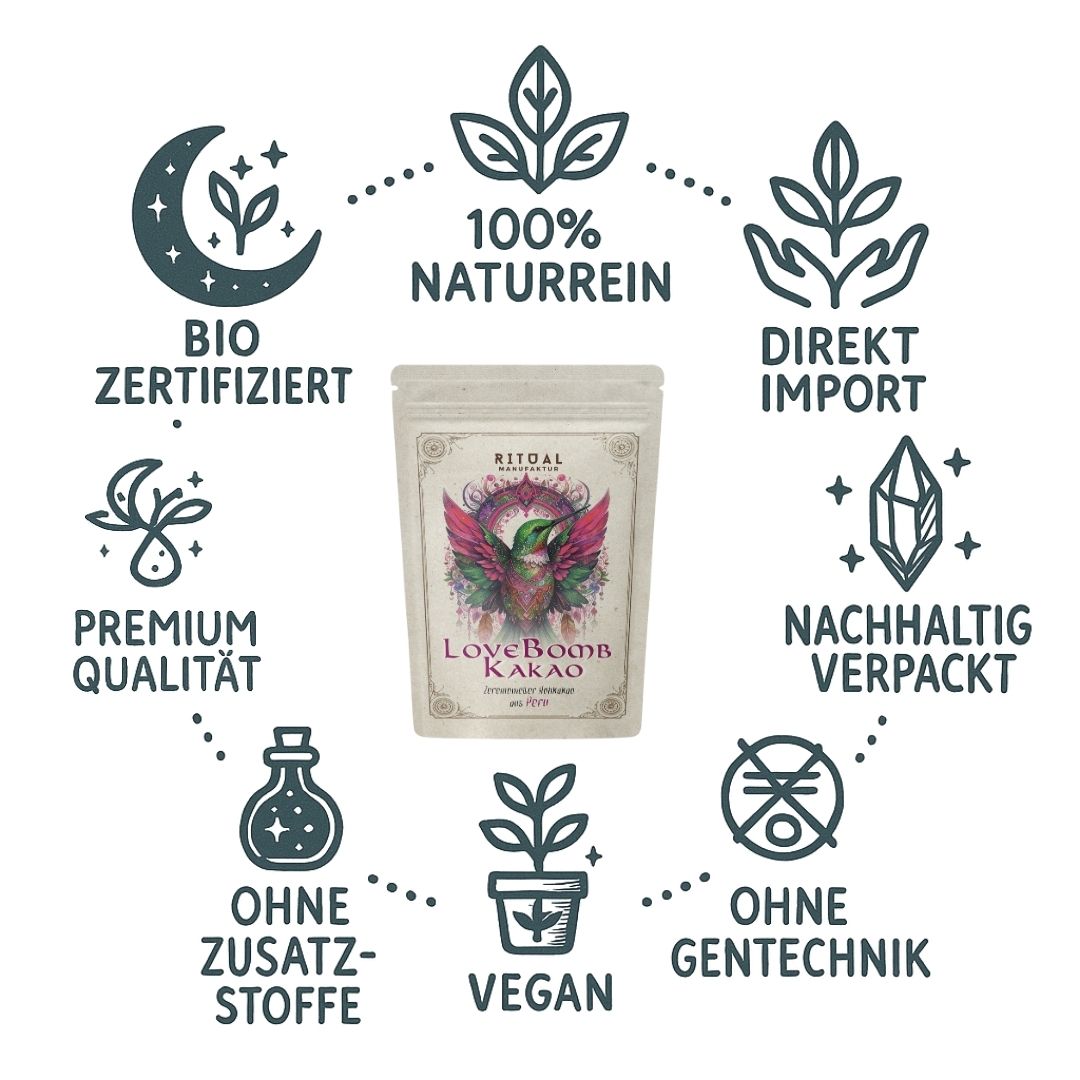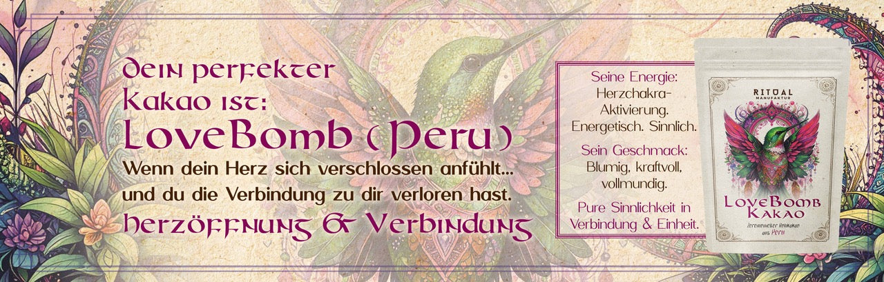 Für die Ritualmanufaktur steht nicht nur die Qualität des Kakaos im Mittelpunkt, sondern auch die Verbindung zu seinem Ursprung. Jede Tasse lässt dich spüren, was die Maya und Azteken seit Jahrtausenden ehrten: Kakao als heilige Pflanze, als Begleiter in Ritualen und als wahre „Nahrung der Götter“.