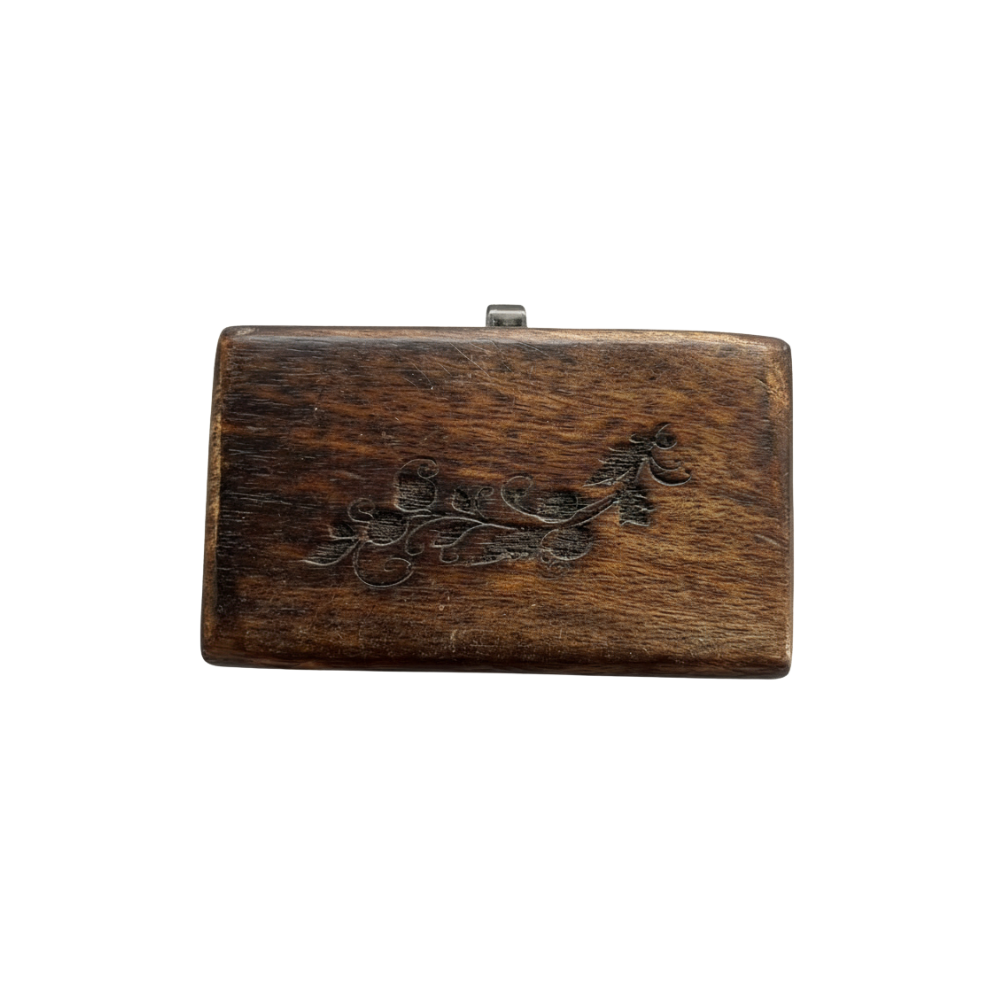Das dunkle, rustikale Holz verleiht der Box eine warme Ausstrahlung, während der Metallverschluss den Inhalt sicher verschließt.