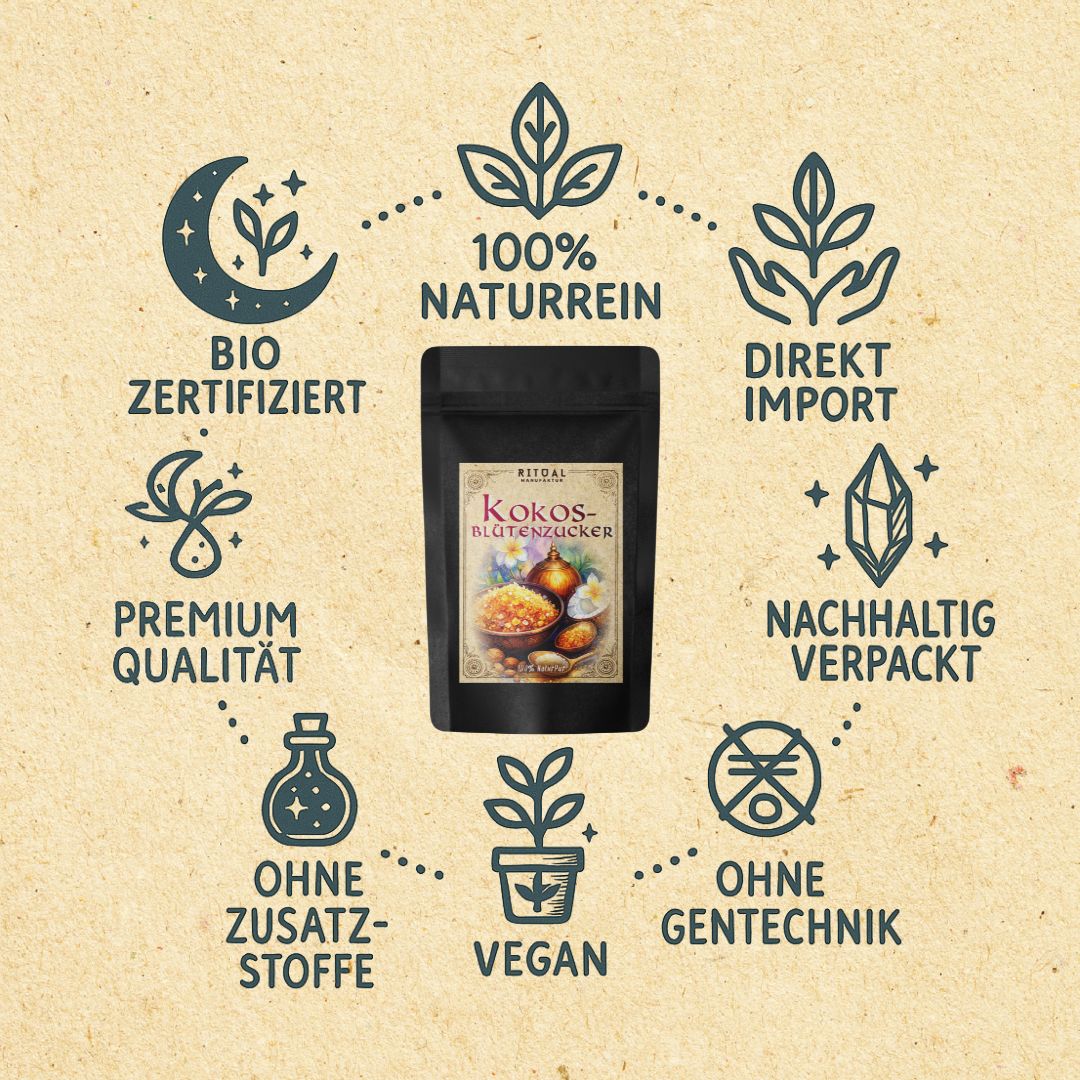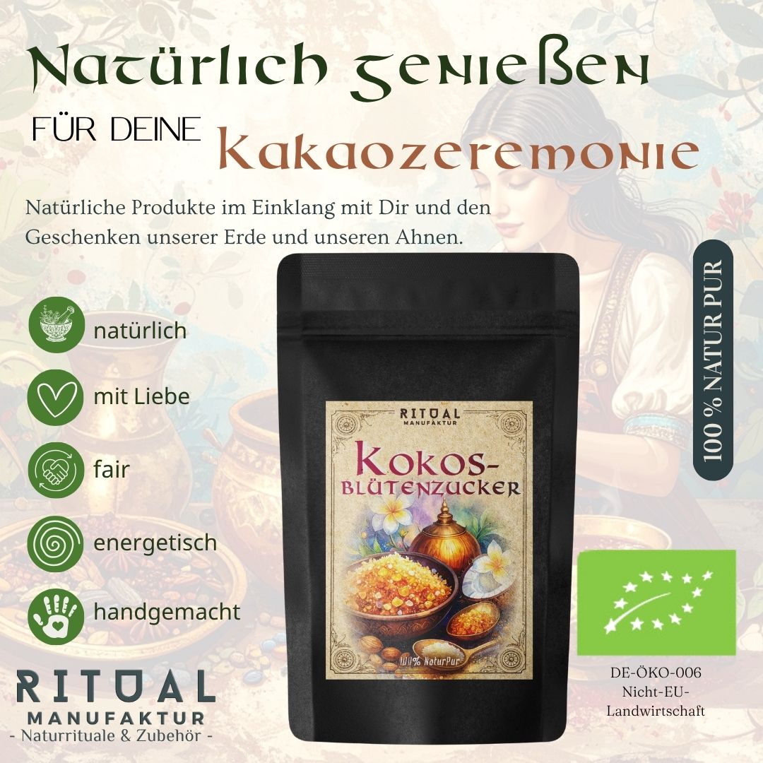 Um Deinem Kakao, je nach Bedarf, etwas Süße für die Seele hinzuzufügen, empfehlen wir Dir unseren Bio Kokosblütenzucker aus Java.