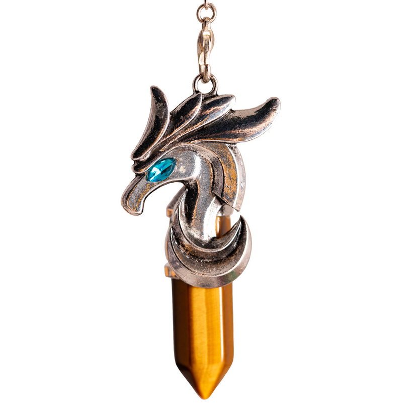 Der kunstvoll gearbeitete Drachenkopf mit funkelndem Auge verleiht diesem Pendel eine besondere Präsenz – ein Symbol für Mut, Weitsicht und spirituellen Schutz.